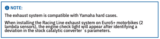 - Power is increased by 1.9 kW (2.6 hp) at 9,100 rpm when compared in back-to-back tests on a MT-07 with a Racing Line (Carbon) exhaust and a standard stock exhaust system