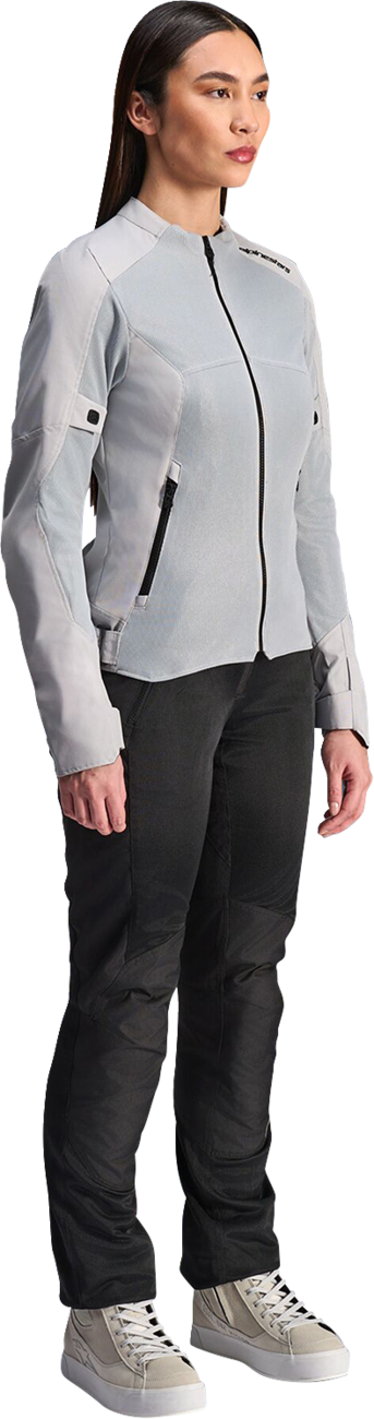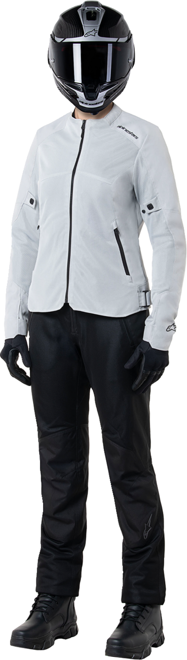 The ALPINESTARS Stella C-1 Air Jacket - Silver, available at DMG Motorsports, delivers both style and functionality. Made from 450D polyfabric and tech mesh, it guarantees resilience and maximum airflow, making it perfect for warmer seasons. This jacket is ergonomically designed to offer freedom of movement, with button sleeve adjusters and waist adjusters for a customizable fit.