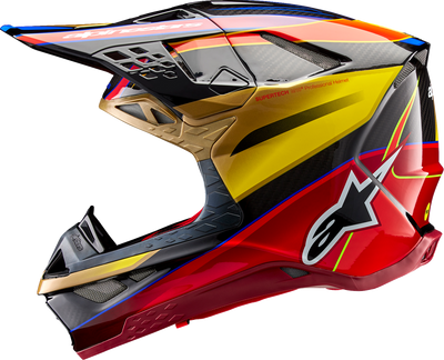 The ALPINESTARS Supertech M10 Era MIPS® Helmet in Pink/Violet/Yellow brought to you by DMG Motorsports offers a wealth of security and design features aimed at keeping you protected while riding. With its sleek, attractive profile, reduced friction on impact, and MIPS® Multi-directional Impact Protection System, your comfort and safety are our top priority.