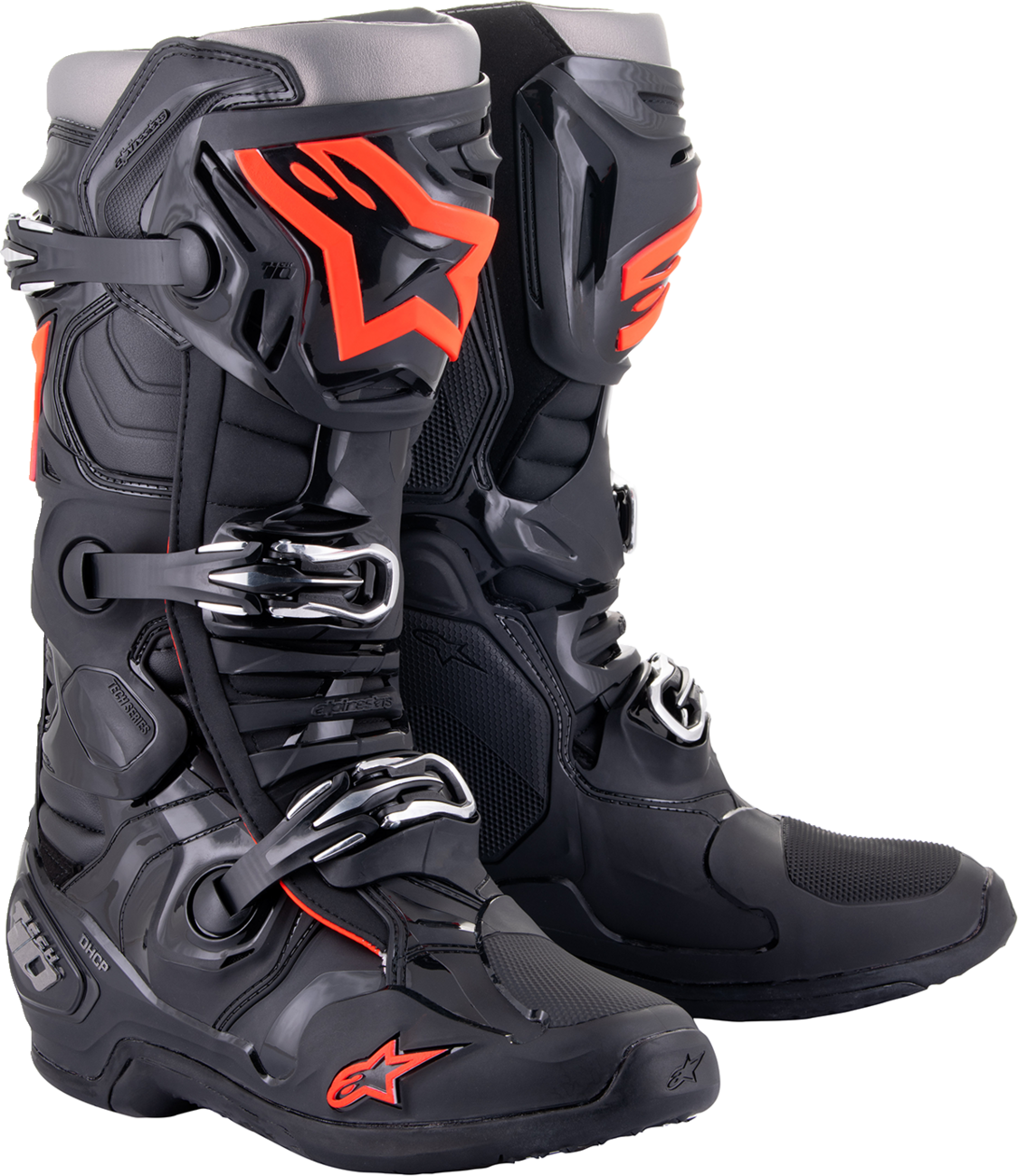 ALPINESTARS Tech 10 Boots from DMG Motorsports combines dual front and rear blade connectors for a complete and seamless flexion control system, engineered to 'float' freely between the lower and upper boot construction. The boots feature an ankle control system, allowing natural ankle movement, vertical compression control, and improved impact protection with their asymmetrical dual pivot arms on frame.