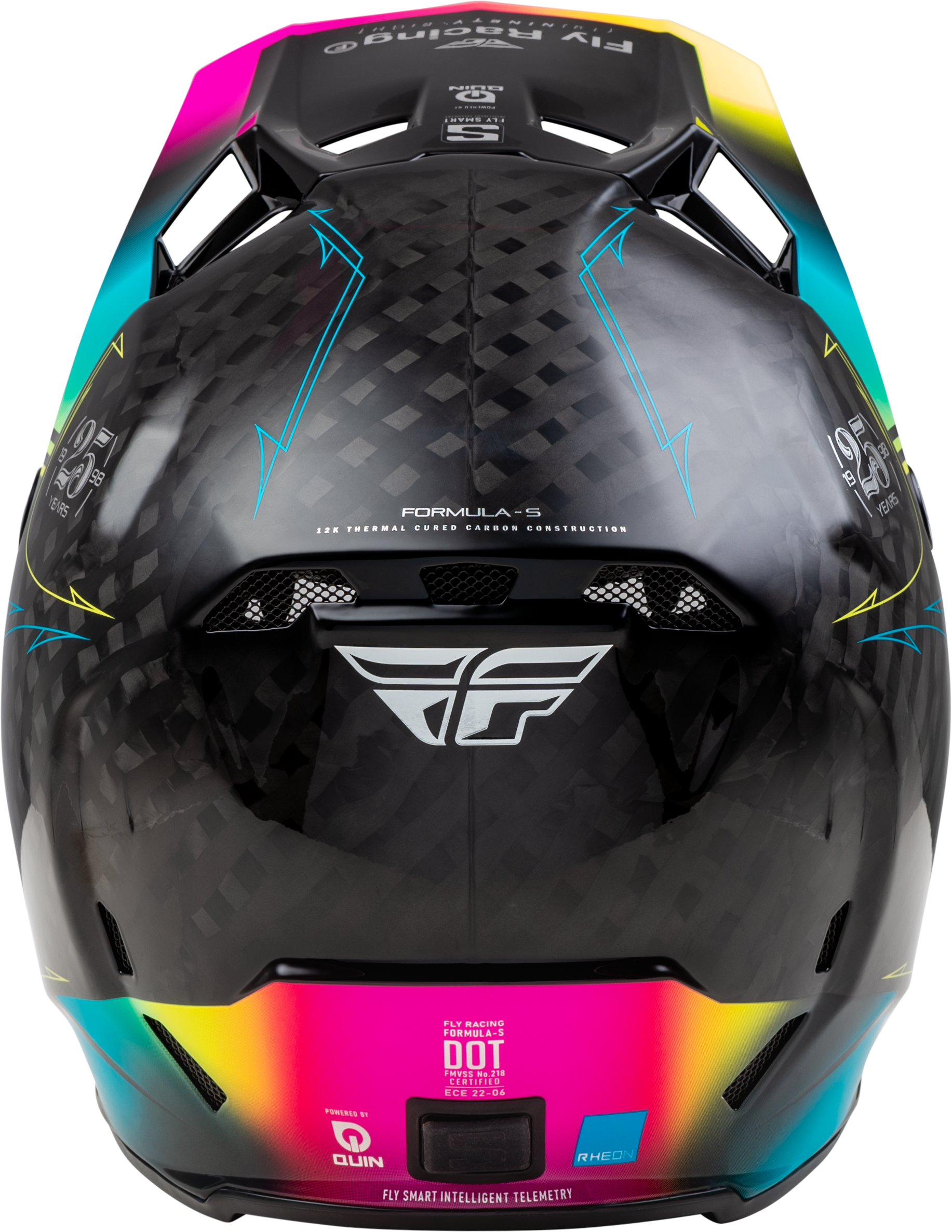 Introducing the FLY RACING Formula S Carbon Legacy Helmet - Black/Electric Blue/Fuschia by DMG Motorsports. This sleek, high-quality helmet is perfect for racing enthusiasts. Offering superior safety with a 12K carbon fiber shell that is lightweight with exceptional penetration resistance.