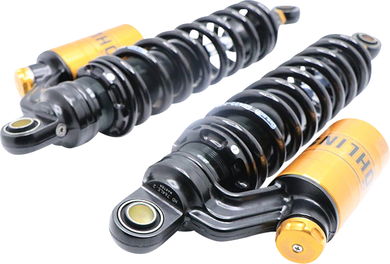 Experience the ultimate in motorcycle suspension with the OHLINS Twin Shocks STX36 Blackline from DMG Motorsports. This set features adjustable rebound and compression damping, a high-pressure nitrogen gas charged single tube design, and the ability to adjust length by .393 inches. The product comes with multiple spring rates available to accommodate a wide range of riders.