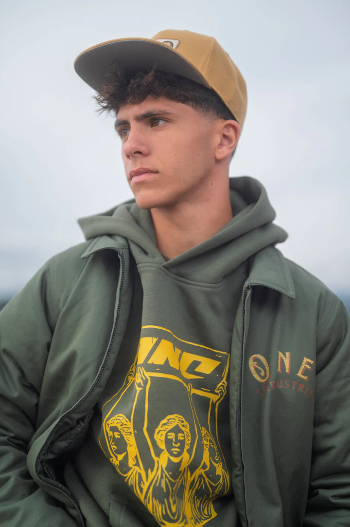 For those looking for rugged durability mixed with clean style. The One Industries Service Jacket is crafted from a sturdy cotton drill exterior mixed with a polyester, padded, quilted interior for maximum comfort and warmth. Available in two colors – Cypress Green and Black along with two distinct graphic designs.